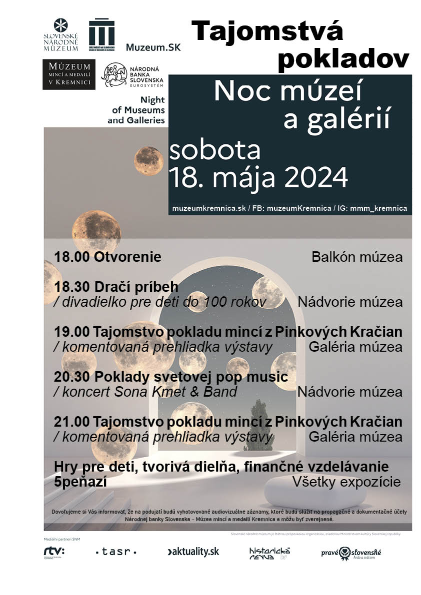 Noc múzeí v NBS – Múzeu mincí a medailí v Kremnici bude mať tento rok podtitul „Tajomstvá pokladov.“ Najväčším lákadlom bude možnosť zdarma prezrieť si novú výstavu v galérii múzea „Tajomstvo pokladu mincí z Pinkových Kračian. Ako v roku 1704 ukryli do zeme vzácne mince“. Podľa kurátora Mareka Budaja sa v ostatných rokoch zachránilo niekoľko výnimočných nálezov mincí, ale poklad z Pinkových Kračian medzi nimi vyniká. Vyniká preto aj spôsob inštalácie, o ktorú sa v troch miestnostiach galérie múzea postaral oceňovaný scénograf Juraj Poliak. Návštevníci sa ocitnú priamo na bojisku povstania proti cisárovi vedeného sedmohradským kniežaťom Františkom Rákoczim II., druhá miestnosť predstavuje miesto nálezu a v tretej miestnosti je vystavený poklad. Bola to neblahá predtucha pred bitkou pri Topoľníkoch, ktorej sa zúčastnili cisárske vojská pod vedením generála Heistera proti povstaleckému generálovi Pekrymu, ktorá viedla majiteľa k uloženiu svojej finančnej hotovosti do zeme v malej dedinke neďaleko Dunajskej Stredy?